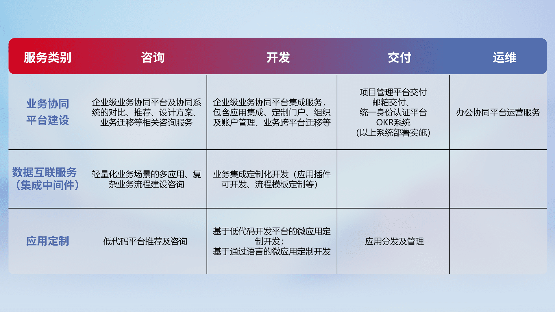 针对钉钉、、、、企微、、、、IDaas等平台级产品提供产品的规划、、方案、、交付、、、、定制化开发等服务,,,,实现如统一协同办公、、、智能客户服务、、、混合会议管理、、、、智能数据查询、、、、等业务场景,,,,实现数字化转型。。。